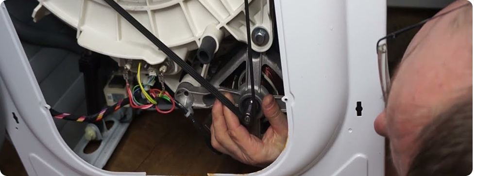 Приводной ремень — это резиновая лента с внутренними рёбрами, которая передаёт вращение от двигателя к барабану через систему шкивов. Со временем резина изнашивается, растягивается или рвётся.