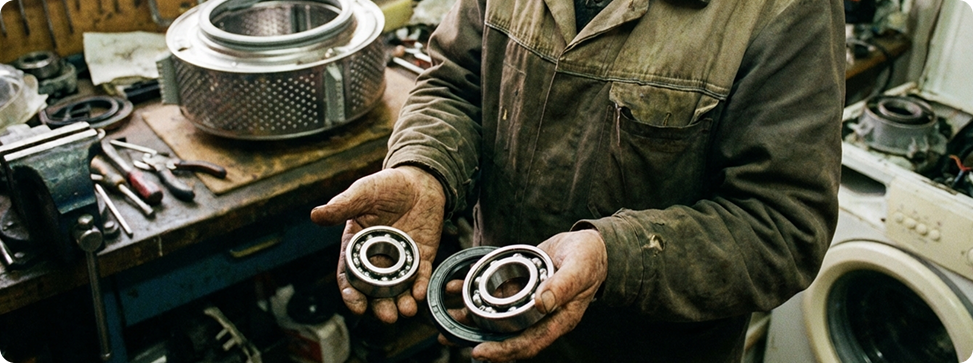 Подшипники обеспечивают плавное вращение тяжёлого барабана с бельём. При их износе появляется люфт, заклинивание, а в критических случаях барабан вообще перестаёт вращаться.