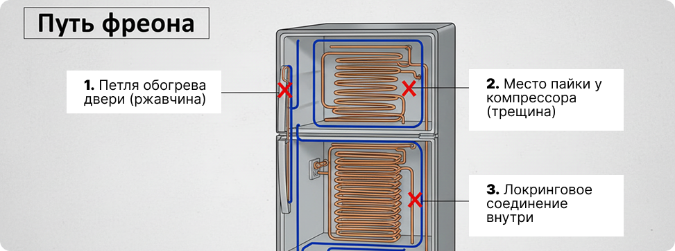- В простых моделях: Фреон сначала бежит в морозилку, затем в холодильное отделение. Если фреон уходит (утечка), первая холодильная камера (там становится тепло), морозилка держится до последнего.
