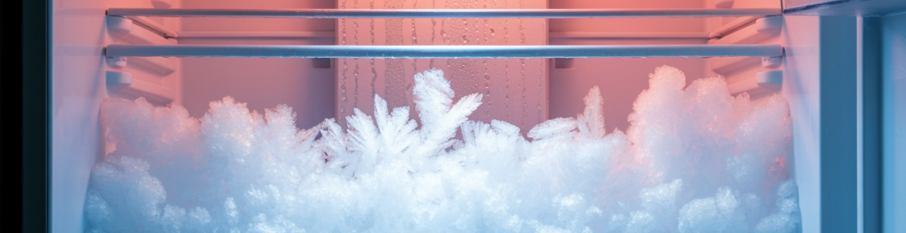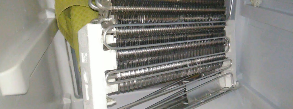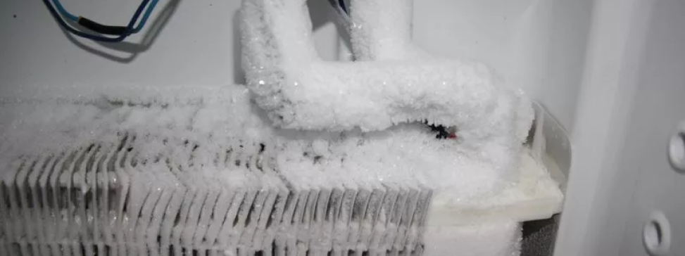 В No Frost‑холодильниках за задней стенкой спрятан испаритель, который периодически прогревается ТЭНом, чтобы убрать иней. Если ТЭН, датчик оттайки или таймер выхода из режима оттайки перестают работать, испаритель покрывается толстой «шубой» льда.