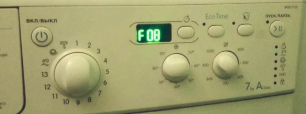 Если ошибка появляется в середине стирки, а машина останавливается или сразу уходит на слив, модуль не видит роста температуры и фиксирует сбой в цепи нагрева — ТЭН, датчик или проводка.