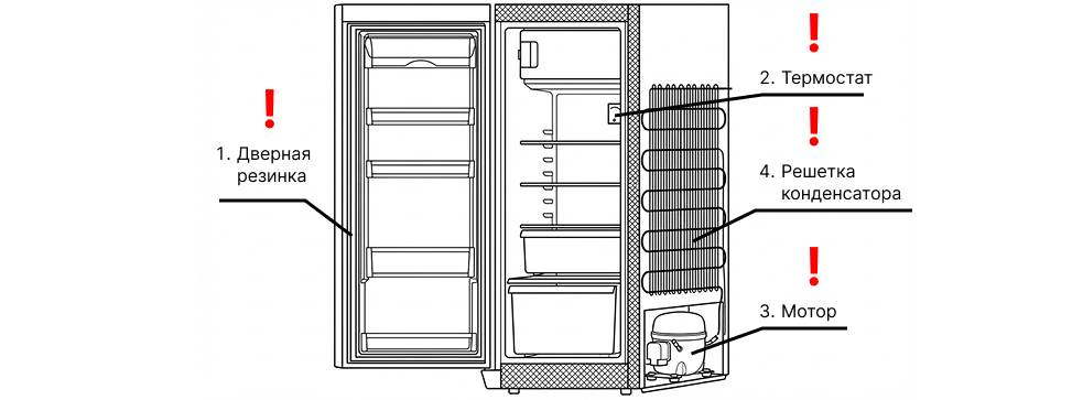 Самая банальная, но частая причина. Резина со временем теряет эластичность, трескается, или провисает дверь. Через щели в камеру заходит теплый воздух (+25°C). Компрессор пытается его охладить, но это все равно что носить воду в решете.